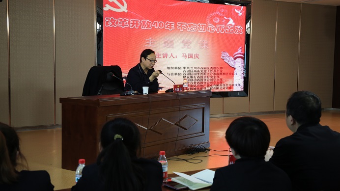 為紀念改革開放40周年,進一步激勵黨員不忘初心、牢記使命。 11月28日,公司黨委牽頭舉辦了 “改革開放四十年 不忘初心再出發”的主題黨課。120余名黨員在我司大會議室聆聽了講座。本次主題黨課在蘭州市西固區委組織部和西固區兩新黨建辦公室指導下開展,本樓宇內5家單位以及兩新辦和社區共同參與。組織這種形式的大黨課,就是貫徹落實全區組織工作會議精神,加強“五化五強”黨支部建設,推進街道社區黨建、單位黨建、樓宇黨建互聯互動,努力提升城市基層黨建工作水平。