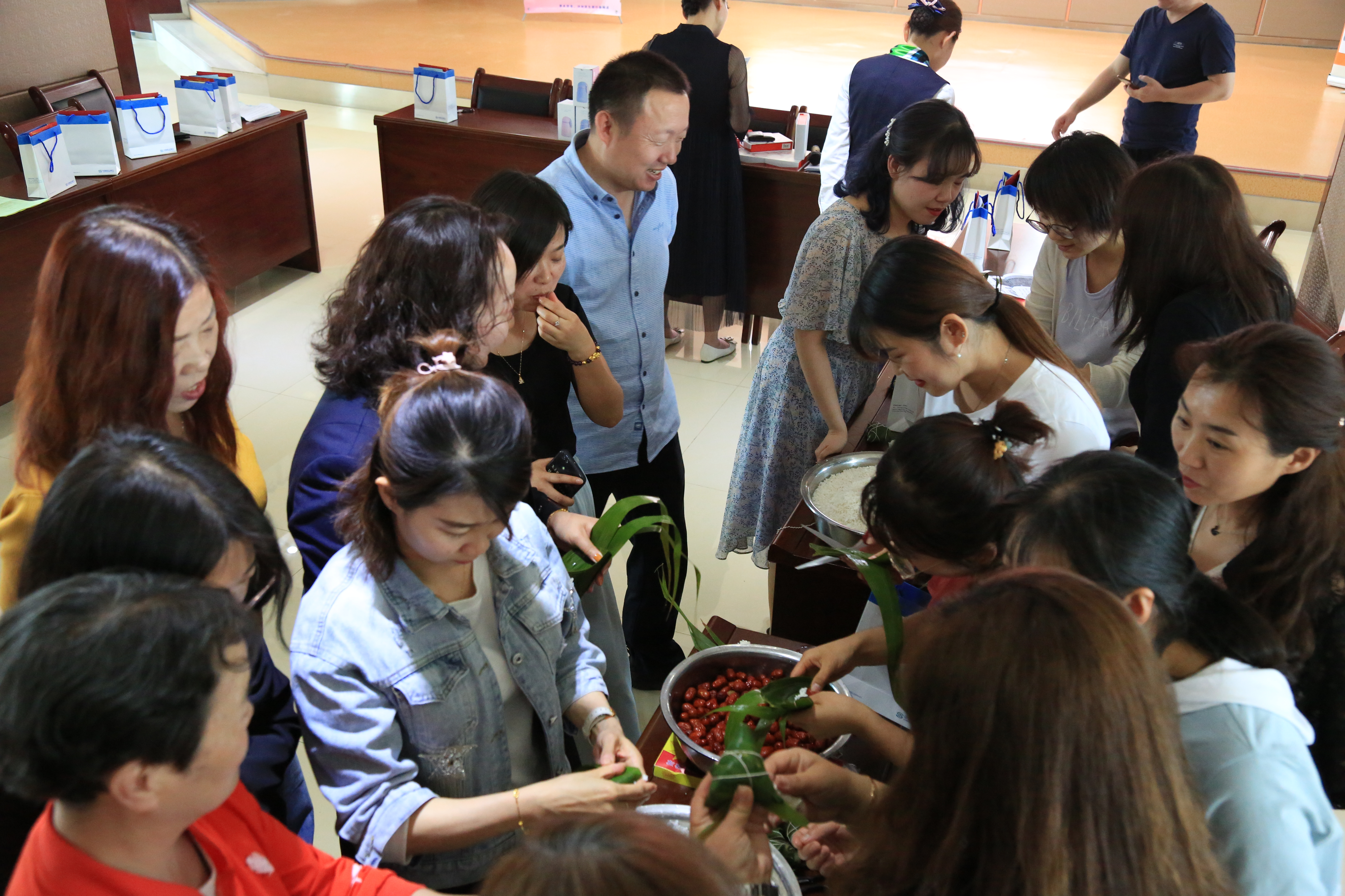 活動當天,伴隨著大家的歡聲笑語,包粽子比賽熱火朝天在濃厚的氣氛中開始,一片片棕葉、一顆顆紅棗、一個個包粽子達人們將活動現場氛圍推向一個又一個高潮。
