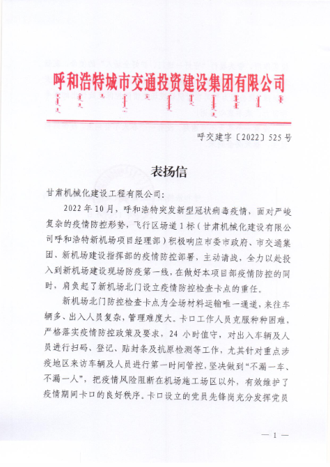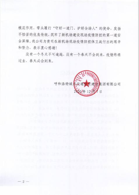 2022年12月7日,呼和浩特市交通投資建設(shè)集團(tuán)有限公司給我司發(fā)來(lái)表?yè)P(yáng)信,表?yè)P(yáng)信中充分肯定了我司呼和浩特新機(jī)場(chǎng)項(xiàng)目部在疫情防控工作上作出的努力,展現(xiàn)了我司的社會(huì)責(zé)任與擔(dān)當(dāng)。