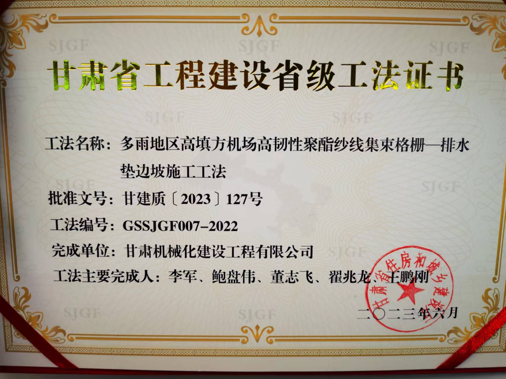 近日,甘肅省住房和城鄉建設廳頒發省級工法證書,我司獲得省級工法榮譽。
