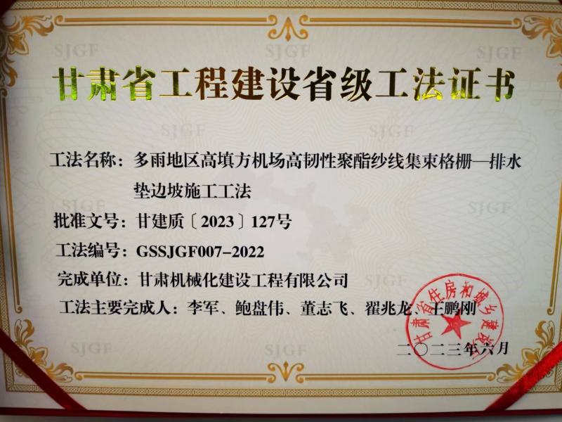 近年來,我司不斷加強技術創新和精品工程創建,科技創新能力和工藝水平再上新臺階。在承建的麗水機場土石方工程02標段中,面對多雨地區高填方施工中的重難點,公司專門組建了科研和施工小組,通過大量現場工藝實踐、工藝改善,提煉出項目重難點的關鍵技術。2023年6月,獲得了“多雨地區高填方機場高韌性聚酯紗線集束格柵—排水墊邊坡施工工法”。