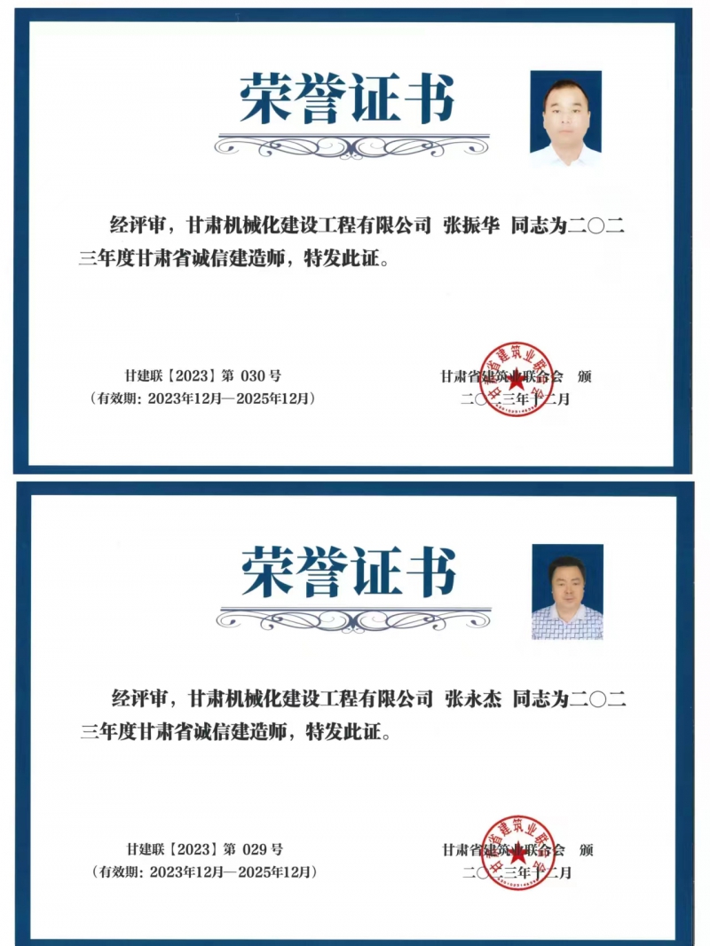張永杰與張振華兩位同志獲得2023年度甘肅省誠信建造師榮譽稱號。